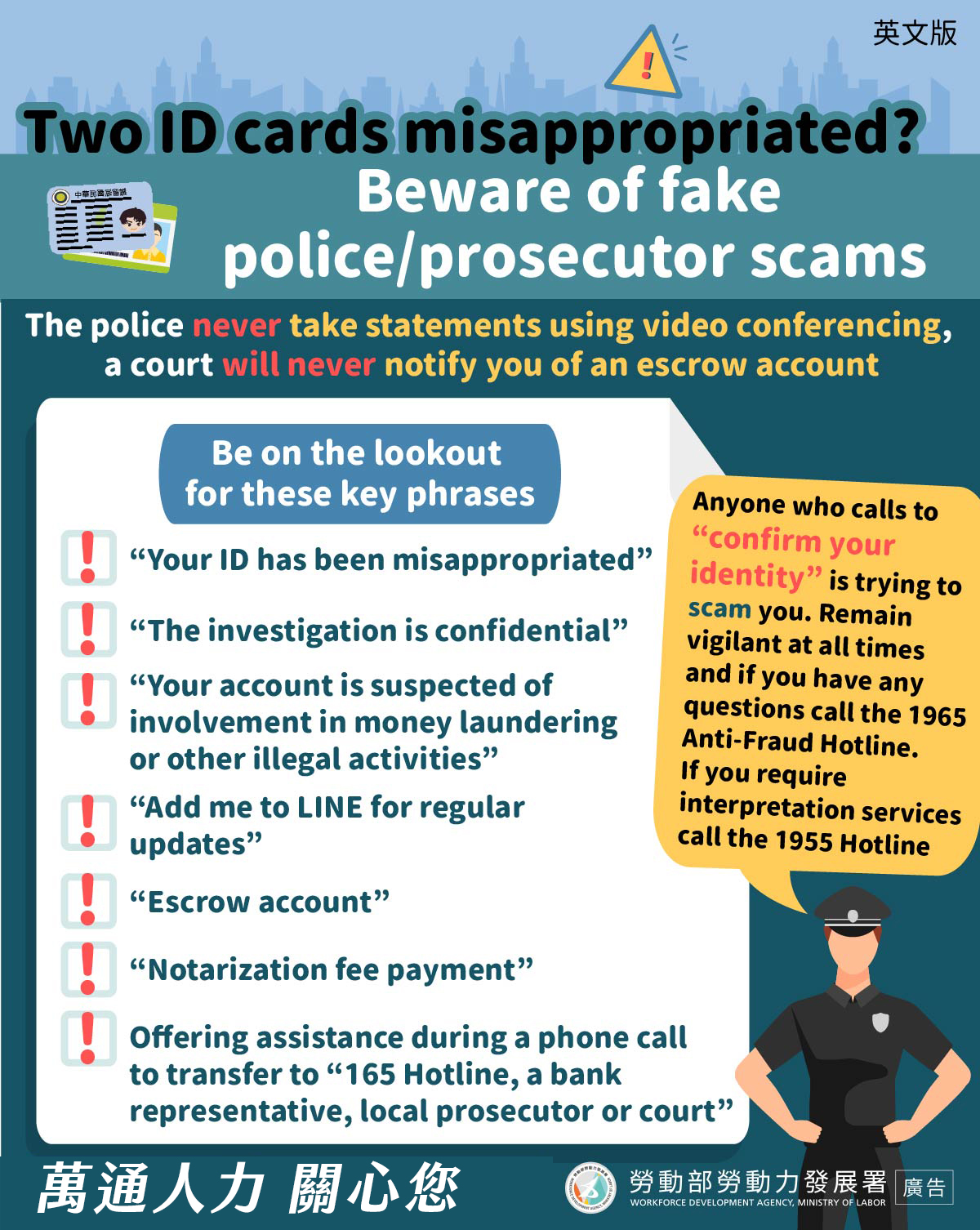請務必記住:真正的檢警機關不會透過電話、簡訊或通訊軟體辦案,也不會要求民眾匯款、交付提款卡、帳戶資料或操作ATM,更不存在任何「安全帳戶」或「資金監管」的說法。只要提到證件被冒用、涉及刑案,又要求處理金錢或保密不說,就極有可能是詐騙。